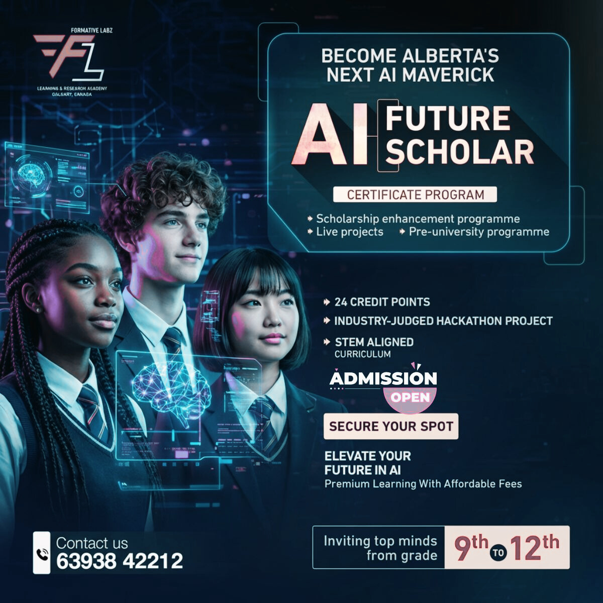 The AI Future Scholar Certificate Program is a premium pre-university learning experience designed for students in Grades 9 to 12 who want to build early capability in artificial intelligence, innovation, and future-focused problem solving. Developed for ambitious high school learners, the program introduces students to the fast-evolving world of AI through live projects, practical learning, and industry-relevant exposure.